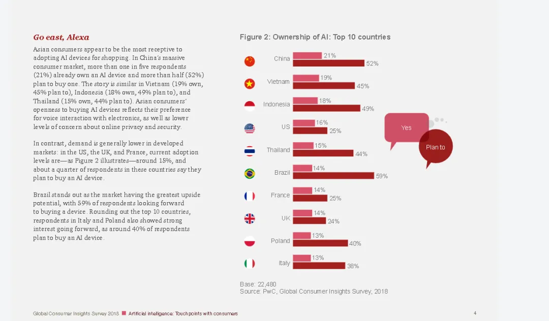 在人工智能飞速发展的今天,编程已成为人类与智能设备对话的 “通用语言”,其重要性不亚于传统的读写能力。普华永道数据显示,中国是 AI 设备渗透率最高的国家,21% 的消费者已拥有 AI 设备,52% 的消费者计划购买。(数据来源:普华永道《Artificial intelligence: Touchpoints with consumers》2018 全球消费者 AI 洞察报告)