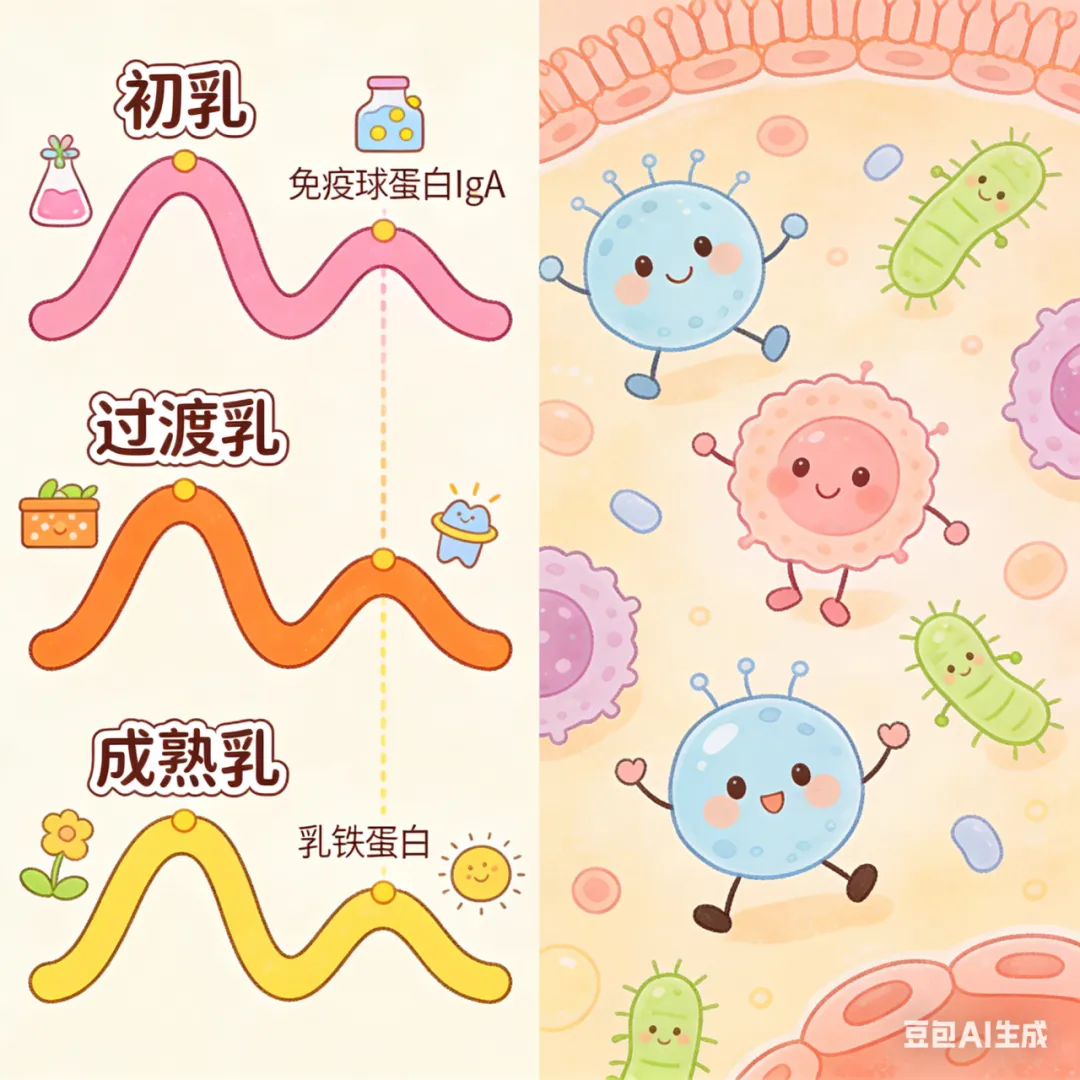 初乳中的免疫球蛋白像“第一剂疫苗”,建立基础防御。母乳成分随时间变化,甚至单次喂养中前后奶的脂肪含量都不同——前奶解渴,后奶养人。