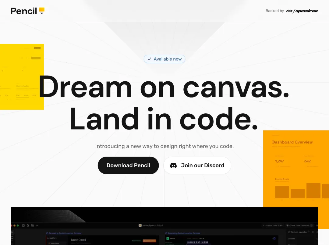 Pencil.dev 首页Pencil.dev 是我最近最兴奋的一个产品。它的 Slogan 很直白:**"Dream on canvas. Land in code."**