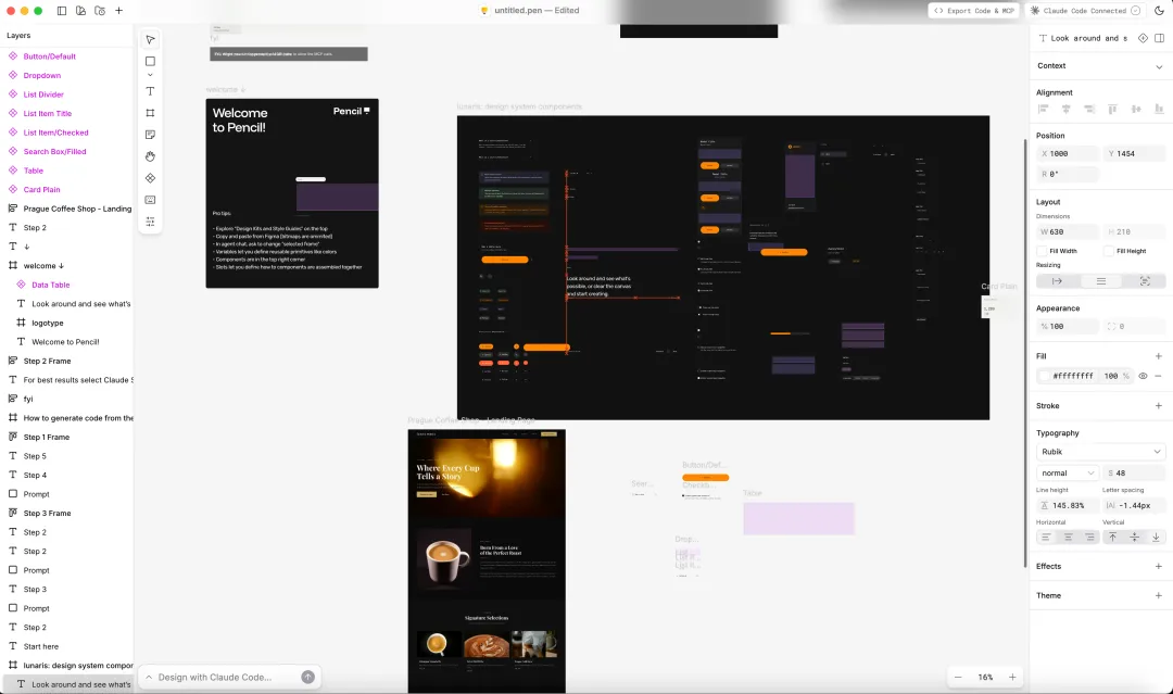 Pencil 工作台这代表什么?给 Claude Code 一个无限画布,让它尽情发挥设计能力,做完了之后借助 Claude Code 本身强大的 Coding 能力,还能直接导出可用的代码。整条工作流围绕 Claude Code 闭环了。