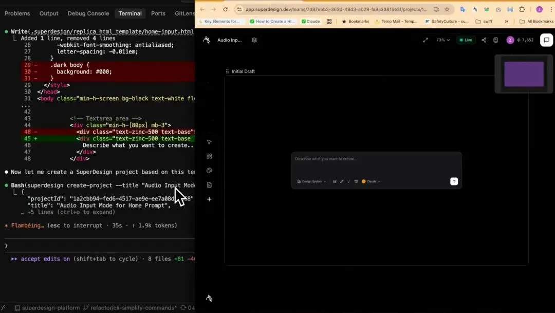 更实用的场景是,让它基于你现有项目来设计。比如你说「帮我看看 @components/LoadingInput.tsx,做的更加松弛一些、蓝色调多一些」,Claude Code 会先理解你的代码上下文,然后调用 Superdesign 出设计稿。满意了直接说一句「接入到当前代码库里面」,它就帮你把代码也写了。