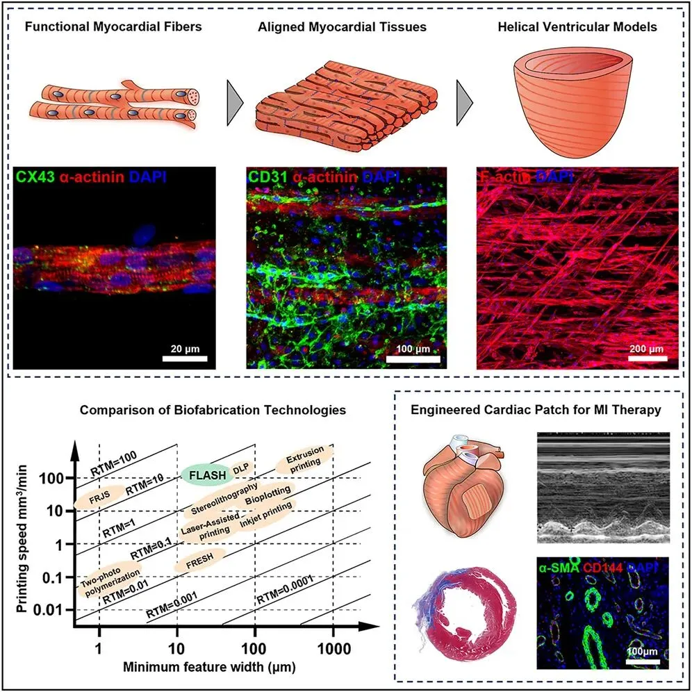 心脏的高效泵血功能,依赖于心室壁中心肌纤维独特的螺旋状各向异性结构。在体外精准模拟这一复杂结构,是构建功能化工程心脏模型及再生修复的核心挑战。目前,传统生物制造技术如电纺丝、生物打印等难以同步实现高细胞密度封装、精准细胞定向与复杂螺旋结构仿生,限制了功能性心脏组织的构建与应用。据麦姆斯咨询报道,针对这一瓶颈,清华大学机械系熊卓课题组研发出流动引导螺旋层级结构组装技术(Flow-Led Assembly for Spiral Hierarchical Structures, FLASH),通过融合微流控纺丝与可编程纤维收集系统,实现了从微纤维成型到宏观螺旋结构组装的跨尺度一体化制造。FLASH将微纤维的连续制备与螺旋排布整合为单一流畅流程,在保障结构精度的同时显著提升制造效率,快速构建出具备高细胞密度与仿生取向的心肌组织。该技术将仿生设计理念与可扩展制造相结合,为心脏疾病建模、药物筛选与再生治疗提供了新的技术平台。基于FLASH构建的心肌组织在电刺激训练下,细胞活性持续保持在95%以上,心肌细胞定向排列比例超过90%,并于21天内实现整体同步收缩。进一步,团队利用该平台成功组装出具备“左旋–环向–右旋”梯度结构的仿生螺旋心室模型,通过调控纤维缠绕角度实现力学性能的各向异性调控。该模型在培养后展现出规律的自发收缩行为,并能对外部电刺激产生同步响应。在大鼠心肌梗死模型中,移植FLASH制备的定向心肌补片后,治疗组在术后28天心功能指标显著改善,纤维化面积有效降低,并促进梗死区新生血管形成,显示出良好的组织修复潜力。相关研究成果以“Scalable fabrication of aligned myocardial tissues with native-like helical architecture for heart repair”为题,发表于Cell Press旗下期刊Cell Biomaterials。清华大学机械系熊卓教授、张婷副教授和方永聪助理教授为论文共同通讯作者,方永聪助理教授、博士生鲁冰川、孙若斌为共同第一作者。博士后杨鹏程、夏静静、博士生叶宇轩等亦对该工作做出贡献。研究获国家自然科学基金、北京市自然科学基金及国家重点研发计划等项目支持。https://doi.org/10.1016/j.celbio.2025.100306延伸阅读: