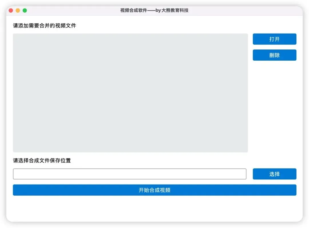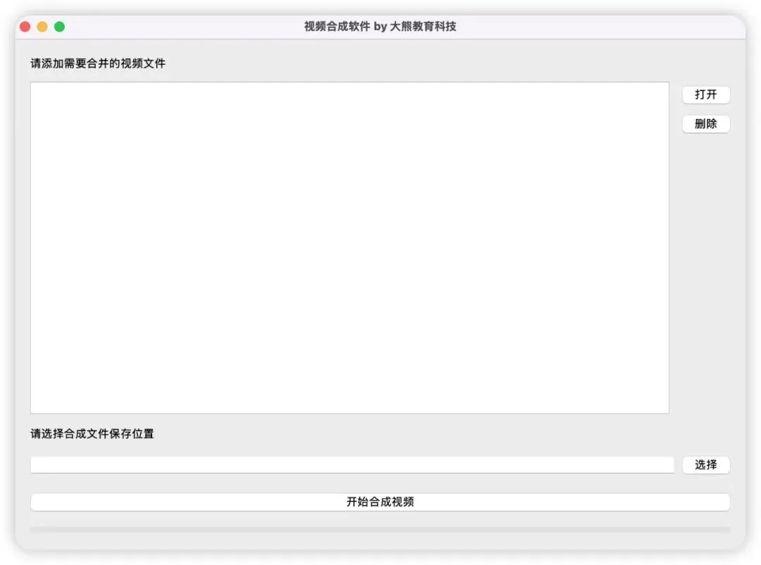 from PyQt6.QtWidgets import QApplication, QWidget, QVBoxLayout, QLabel, QHBoxLayout, QListWidget, QPushButton# 导入 sys 模块,用于接收命令行参数和程序退出import sysclassMainWindow(QWidget):def__init__(self, *args, **kwargs): super().__init__(*args, **kwargs)# 设置窗口标题栏显示的文字 self.setWindowTitle('视频合成软件 by 大熊教育科技')# 设置窗口的初始大小(宽度: 853px, 高度: 597px) self.resize(853, 597)# 定义主布局:一切的父容器 layout = QVBoxLayout()# 将当前窗口(self)的布局设置为刚才创建的 layout self.setLayout(layout)# 选择文件提示label self.input_file_label = QLabel('请添加需要合并的视频文件')# 将标签控件添加到垂直布局中,使其在窗口中显示出来 layout.addWidget(self.input_file_label)# 实例化水平布局容器,用于容纳左侧列表和右侧按钮组 list_content = QHBoxLayout()# 初始化列表控件,用于展示用户添加的视频文件路径 self.list_path = QListWidget()# 将列表控件添加至水平布局的左侧 list_content.addWidget(self.list_path)# 构建右侧按钮组的垂直布局容器 buttons = QVBoxLayout()# 实例化功能按钮,并定义为实例属性以便后续绑定点击事件 self.open_btn = QPushButton('打开') self.del_btn = QPushButton('删除')# 将按钮按垂直顺序注册到按钮布局容器中 buttons.addWidget(self.open_btn) buttons.addWidget(self.del_btn)# 其作用是自动填满剩余的空白区域,将上方已添加的控件(如“打开”、“删除”按钮)推向顶部 buttons.addStretch(1)#【核心步骤】将右侧的垂直按钮布局嵌套进整体的水平布局中 list_content.addLayout(buttons)# 将配置完成的复合水平布局(包含列表和按钮组)挂载到窗口的主垂直布局中 layout.addLayout(list_content) self.show() # 显示窗口if __name__ == '__main__': print(sys.argv) app = QApplication(sys.argv) w = MainWindow() sys.exit(app.exec())