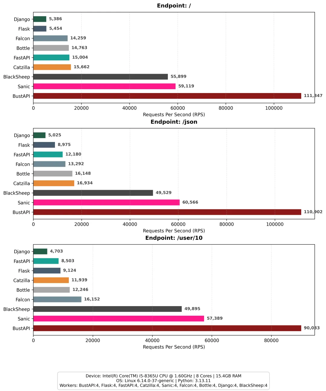 根据官方基准测试,BustAPI 在 Linux 上使用 4 个 worker 可以达到: