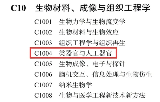 值得关注的是,本年度指南在生物材料、成像与组织工程学(C10)分类项下,正式设立了“类器官与人工器官”二级申请代码(C1004)。