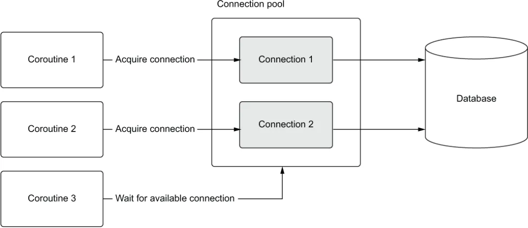 图 5.2 协程 1 和 2 获取连接运行查询,而协程 3 等待连接。当协程 1 或 2 任一完成时,协程 3 可以使用刚释放的连接并执行其查询。