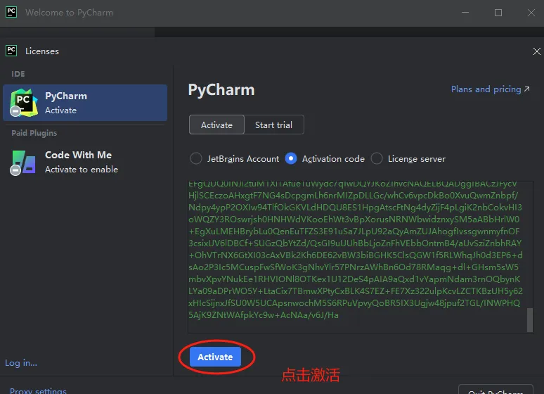 这里要选择 Activation code 选项,然后将复制的激活码粘贴进来,选择 Activate