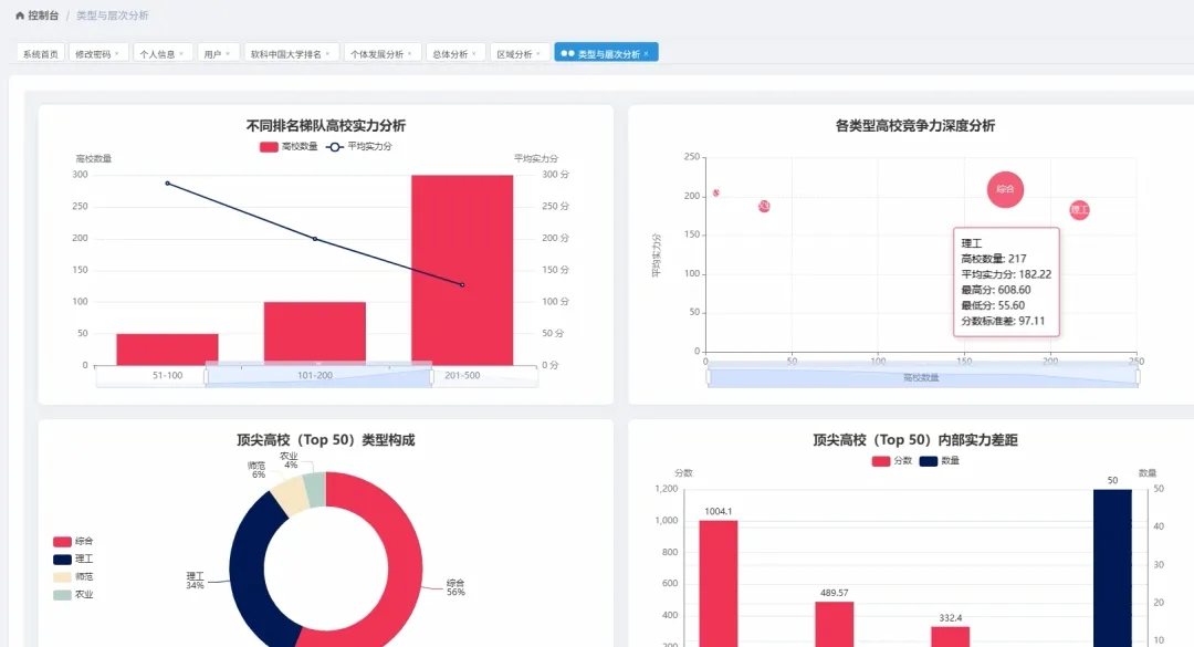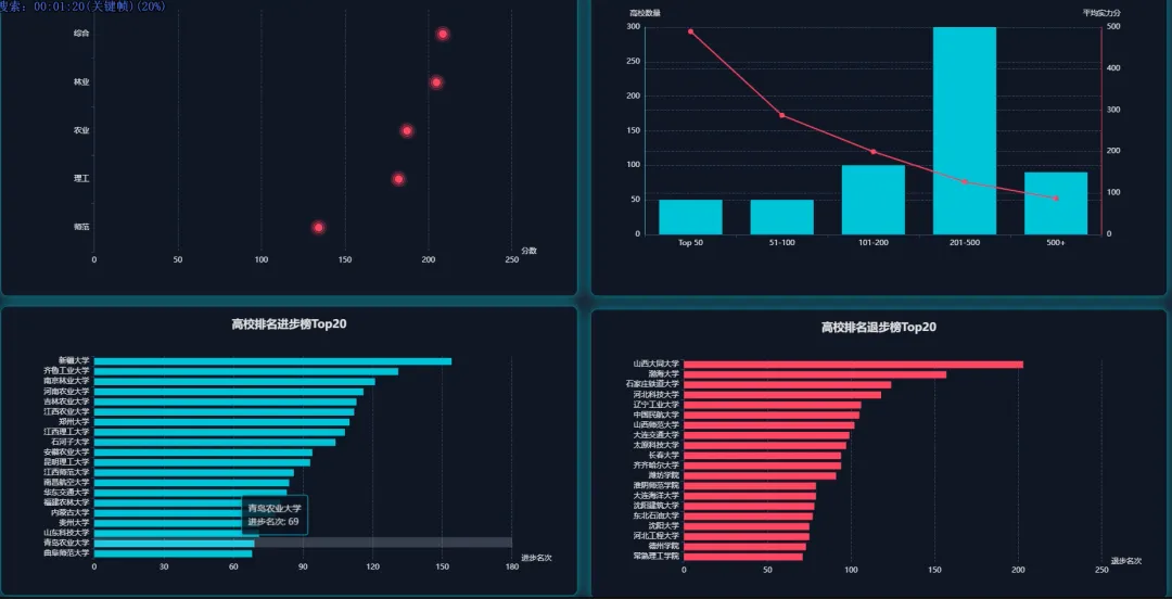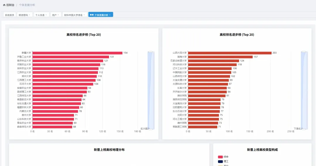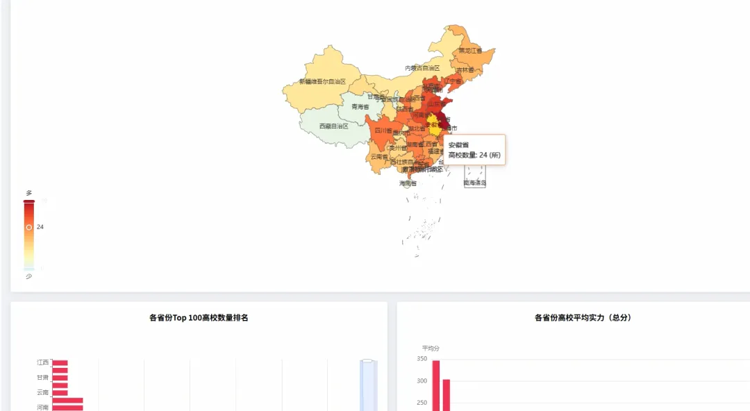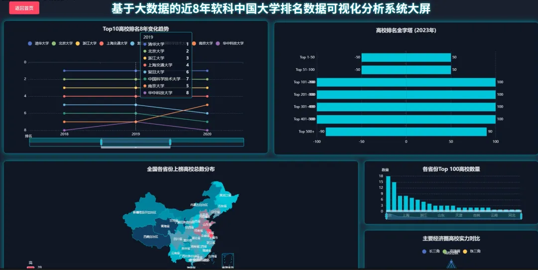 from pyspark.sql import SparkSession, Windowfrom pyspark.sql.functions import col, count, rank, desc, asc# 初始化SparkSession,这是所有Spark程序的入口spark = SparkSession.builder \ .appName("UniversityRankingAnalysis") \ .config("spark.sql.warehouse.dir", "/user/hive/warehouse") \ .enableHiveSupport() \ .getOrCreate()# 假设df是一个已经加载好的Spark DataFrame,包含Year, Rank, CN_Name, Province, Type, Score等列# df = spark.read.csv("hdfs://path/to/ranking_data.csv", header=True, inferSchema=True)def get_top10_trend(df): # 核心功能1: 顶尖高校(Top 10)近8年排名变化 # 筛选出每年排名前10的高校 top10_df = df.filter(col("Rank") <= 10) # 为了追踪变化,我们需要按学校名称和年份进行排序 # 这样在后续处理中,每个学校的排名会按时间顺序排列 sorted_df = top10_df.orderBy(asc("CN_Name"), asc("Year")) # 选择我们关心的列:年份、学校名称、排名 result_df = sorted_df.select("Year", "CN_Name", "Rank") # 将Spark DataFrame转换为Pandas DataFrame以便API返回或进一步处理 # 在实际应用中,可能直接返回JSON格式 return result_df.toPandas().to_dict(orient="records")def get_top100_by_province(df, target_year): # 核心功能2: 各省份顶尖(Top 100)高校数量 # 筛选出指定年份且排名在Top100的高校 top100_df = df.filter((col("Year") == target_year) & (col("Rank") <= 100)) # 按省份进行分组,然后计算每个省份内的高校数量 province_count_df = top100_df.groupBy("Province").agg(count("CN_Name").alias("university_count")) # 按高校数量降序排列,找出教育资源最集中的省份 sorted_province_df = province_count_df.orderBy(desc("university_count")) # 转换为字典列表格式返回 return sorted_province_df.toPandas().to_dict(orient="records")def get_university_progress_ranking(df, start_year, end_year): # 核心功能3: 高校排名进步榜(对比两个年份) # 分别获取起始年份和结束年份的排名数据 start_df = df.filter(col("Year") == start_year).select(col("CN_Name").alias("Name_Start"), col("Rank").alias("Rank_Start")) end_df = df.filter(col("Year") == end_year).select(col("CN_Name").alias("Name_End"), col("Rank").alias("Rank_End")) # 通过学校名称将两个年份的数据连接起来 # 使用内连接,只保留两年都在榜的高校 joined_df = start_df.join(end_df, start_df.Name_Start == end_df.Name_End, "inner") # 计算排名变化量,起始排名减去结束排名 # 结果为正数表示排名上升(进步),为负数表示下降 progress_df = joined_df.withColumn("Rank_Change", col("Rank_Start") - col("Rank_End")) # 筛选出有进步的高校(排名变化 > 0) progressed_df = progress_df.filter(col("Rank_Change") > 0) # 按排名变化量降序排列,进步最多的排在最前面 final_df = progressed_df.orderBy(desc("Rank_Change")) # 选择最终要展示的列并返回 return final_df.select(col("Name_End").alias("CN_Name"), "Rank_Start", "Rank_End", "Rank_Change").toPandas().to_dict(orient="records")