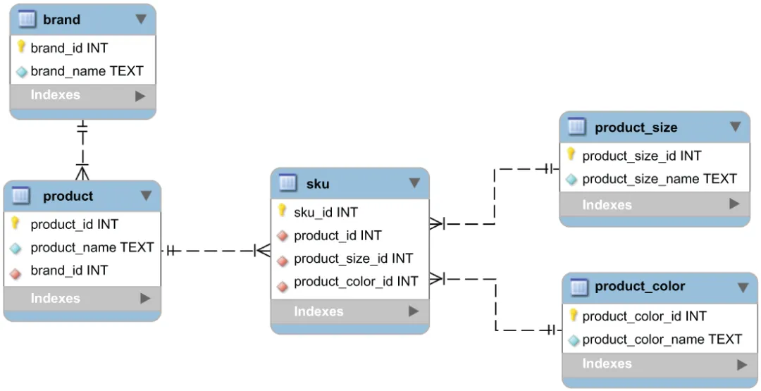 产品属于一个品牌,品牌与产品之间是一对多关系。为简化,我们的产品只包含名称。比如“福克斯”是一款产品,品牌是“福特”。此外,每个产品有多种尺寸和颜色。我们将可用的尺寸和颜色定义为 SKU。