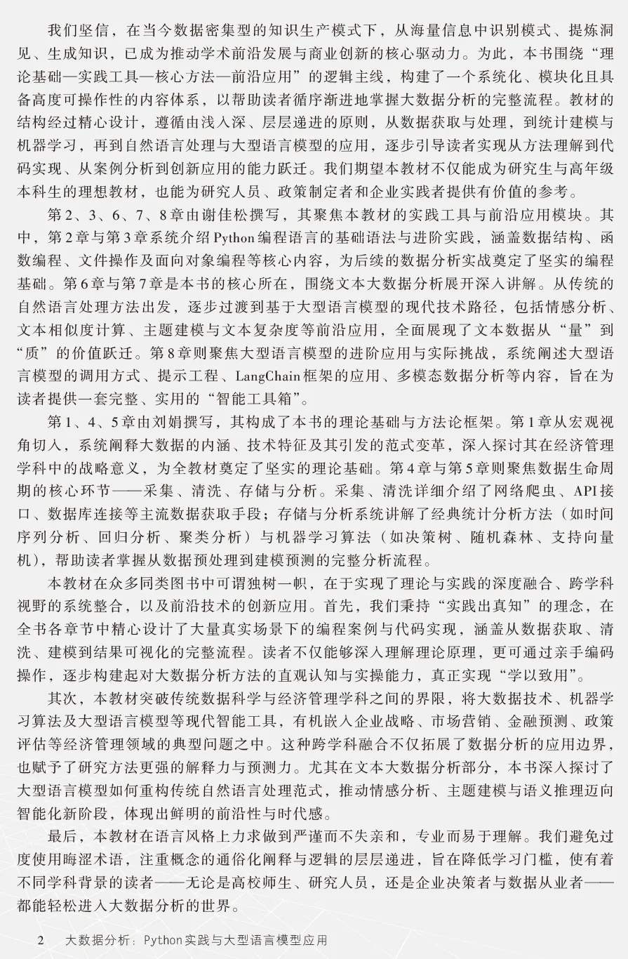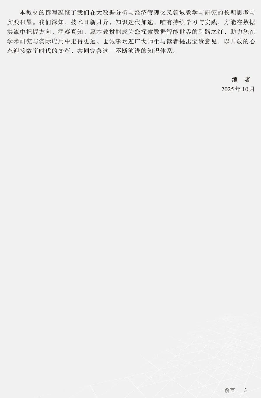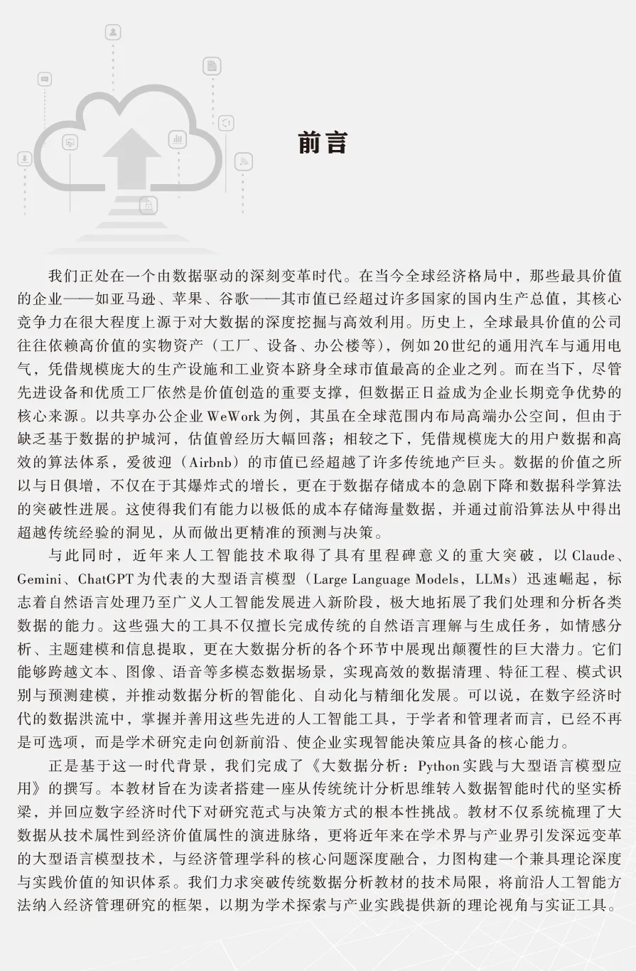 作为“高等学校新文科数字经济学系列教材”的新锐力作,本书紧扣数字经济时代科研范式转型与新型人才培养变革的核心趋势,深度融合大数据分析技术与经济管理学科的前沿研究方法。全书突破传统结构化数据的局限,构建了从非结构化数据采集、清洗与挖掘,到机器学习建模,再到大语言模型与生成式人工智能的经管领域创新应用的完整技术—理论框架。