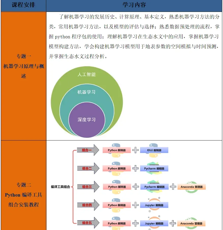 了解机器学习的发展历史、计算原理、基本定义,熟悉机器学习方法的分类,常用机器学习方法,以及模型的评估与选择;熟悉数据预处理的流程,掌握python程序包的使用;理解机器学习在生态水文中的应用,掌握机器学习模型构建方法,学会构建机器学习模型用于地表参数的空间模拟与时间预测,并掌握生态水文过程分析。