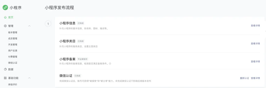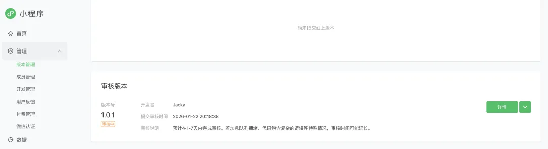 如果测试没问题,就可以点击开发工具上方的上传按钮,代码就会自动上传到微信小程序后台,然后回到微信后台进行认证和版本管理了。