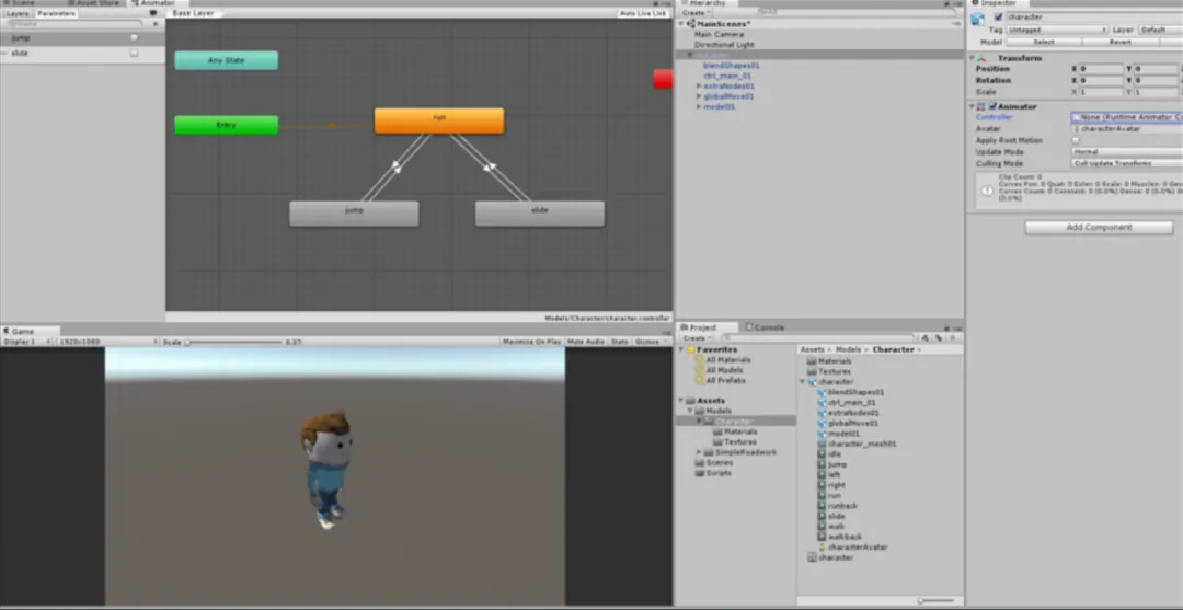 状态管理:使用有限状态机(FSM)设计角色状态(idle/run/jump/attack),通过动画控制器(Animator)实现状态与动画的无缝衔接。