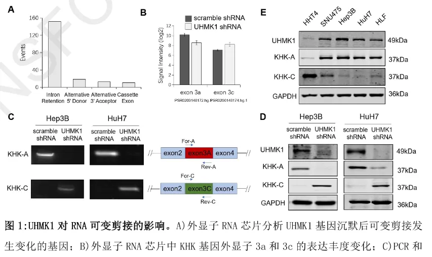 团队通过全基因组外显子芯片分析发现:沉默 UHMK1 可影响 195 个基因的 RNA 可变剪接模式,其中 KHK 的剪接变化最为显著 ——UHMK1 缺失会导致 KHK-A 表达下调、KHK-C 表达上调,且这一趋势在 Hep3B、HuH7 等多株肝癌细胞系中均得到验证(相较于非恶性肝细胞株 HHT4,肝癌细胞中普遍存在 UHMK1 与 KHK-A 高表达、KHK-C 低表达的关联特征)。