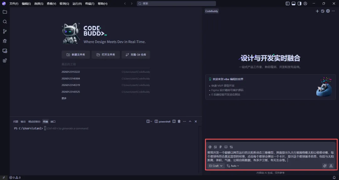 于是我就打开deepseek问下国内有啥这样工具可以用,deepseek给我推荐了腾讯的CodeBuddy IDE,并提供下载网址,这是一个电脑桌面软件,我下载、注册就能打开使用,第一次用一脸茫然,我就问deepseek告诉我怎么基本操作,它迅速给我一个科普后,我就尝试用它做了一个“太阳系三维模型”,我的设想是: