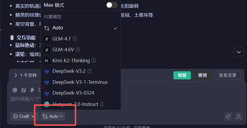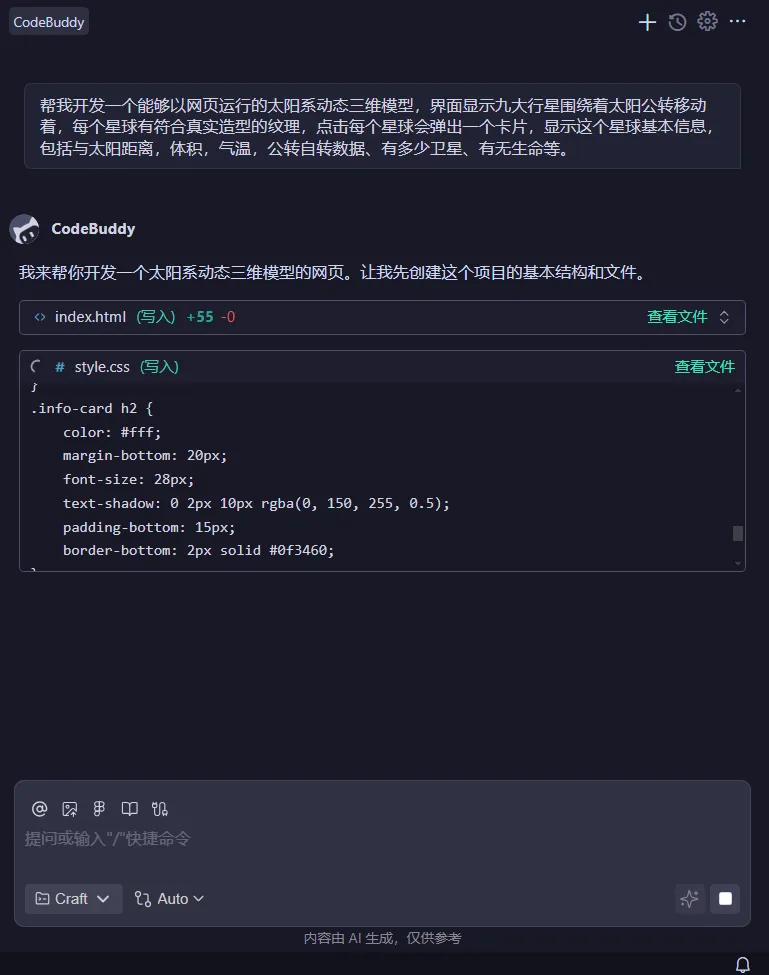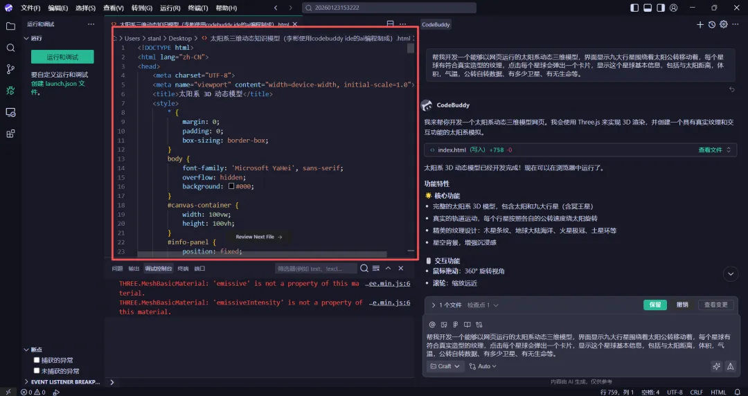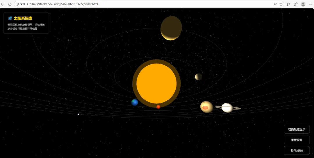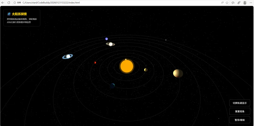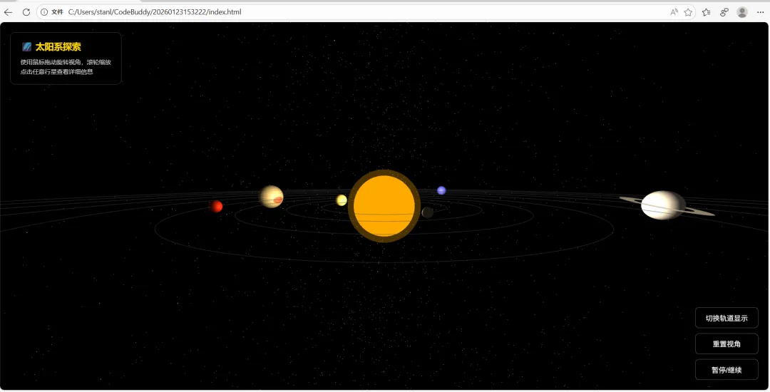 上述从我突然想体验下ai编程,到问deepseek有什么工具推荐,到下载了CodeBuddy IDE注册使用,到给它提需求编程生成这个三维立体太阳系知识模型,前后不到一小时就基本实现了。