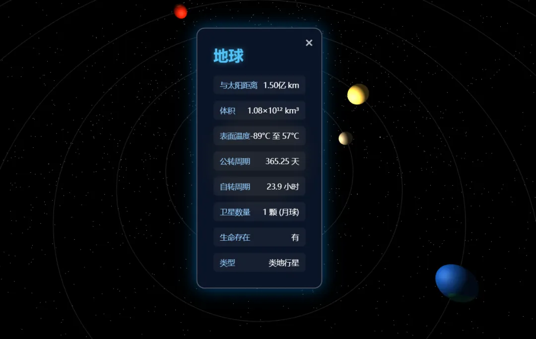 此外鼠标点击每个星球,会显示我预设要它显示的基本信息↓