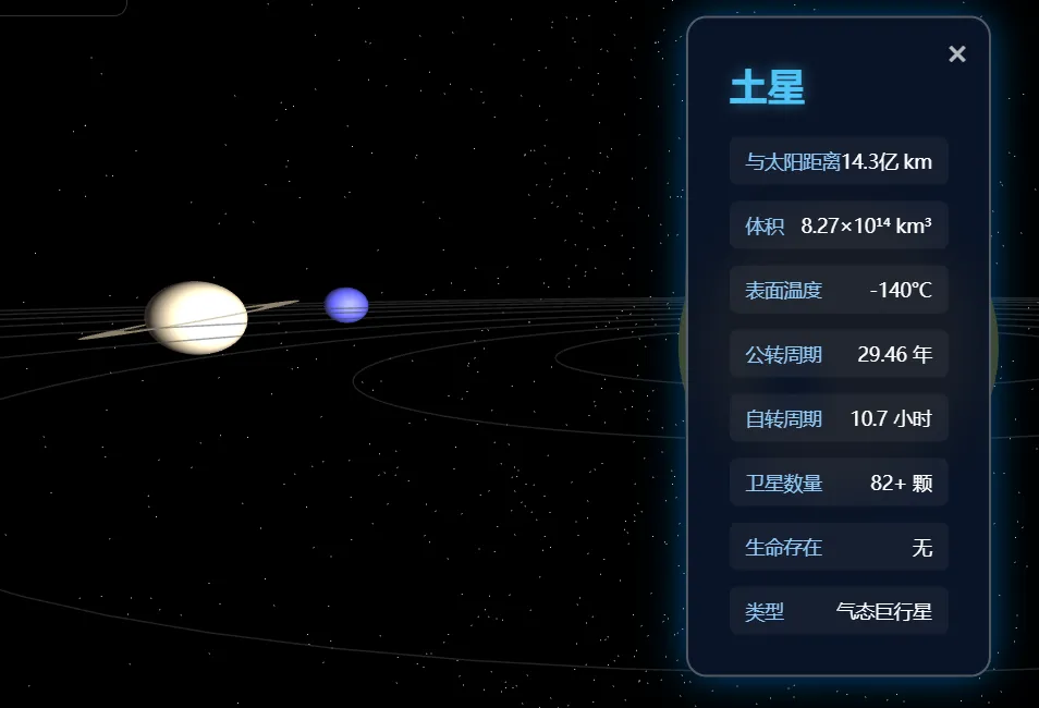 做一个能够在网页版打开的三维立体太阳系模型,每个星球会围着太阳星公转,我点击每个星球,它会弹出一个卡片显示它基本信息。