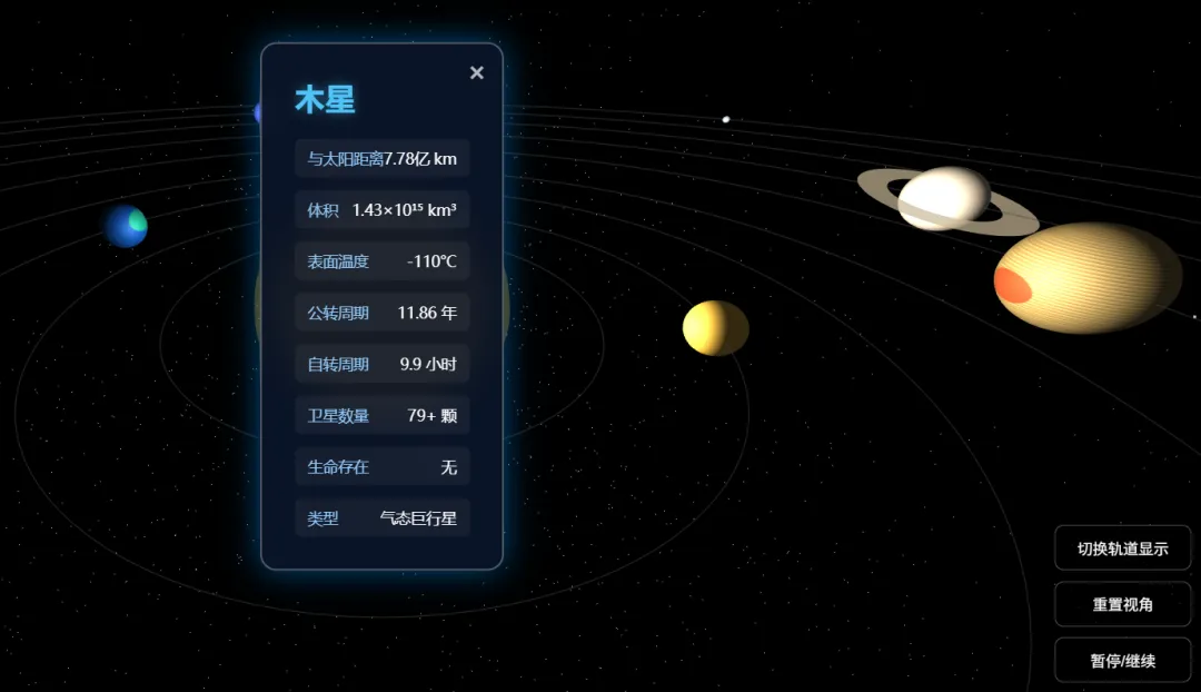 太阳系呈现三维效果,可以不同角度观看,可以拉近拉远观察,并且各个行星围绕着太阳公转着↓