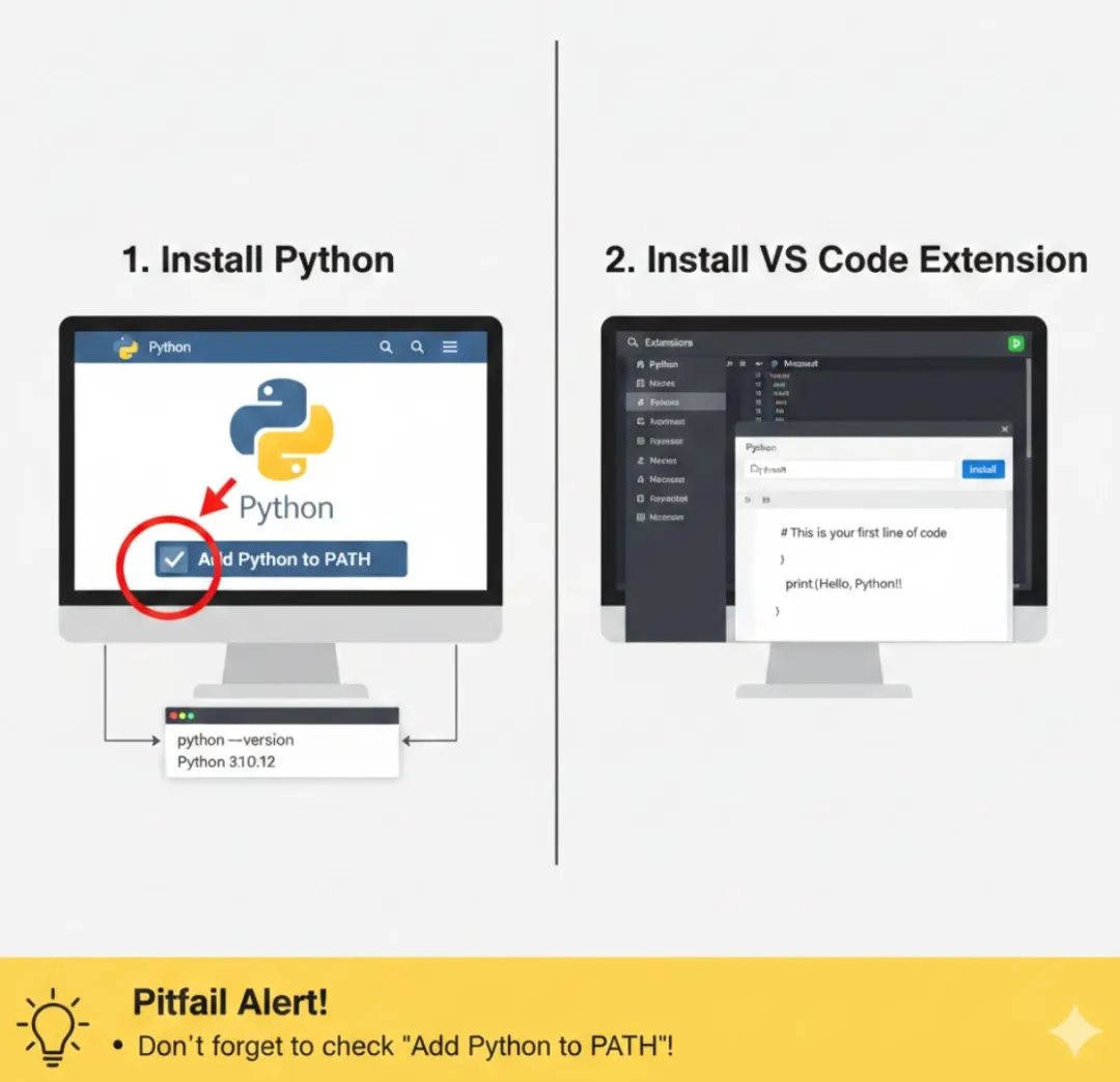 PATH 环境变量是生命线: 如果你的命令行无法识别 python 命令,99% 的原因就是 PATH 没设置好。可以去系统环境变量中手动添加 Python 安装路径。