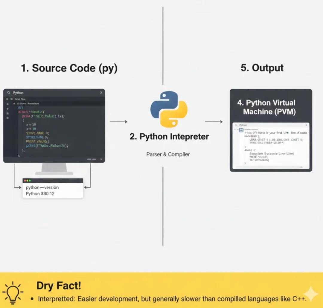 干货点: 这种机制使得 Python 开发效率高(无需漫长的编译),但通常执行速度会比编译型语言慢一些。