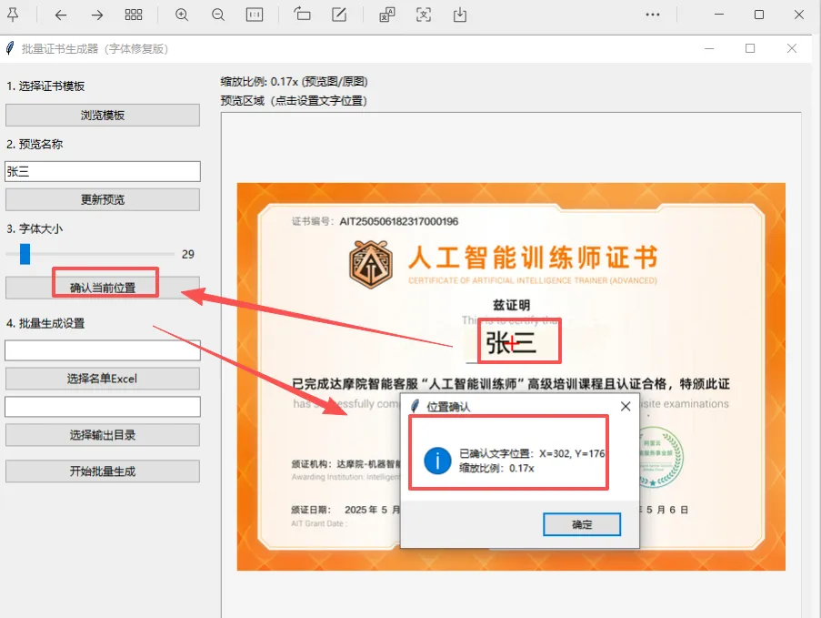 main 启动守卫CertificateGenerator 主类2.1 初始化 & UI 搭建2.2 模板加载与预览2.3 文字定位与字体渲染2.4 批量生成核心引擎2.5 跨平台字体兜底策略if __name__ == "__main__":try:import pandas, openpyxlexcept ImportError: messagebox.showerror("依赖缺失", "请先安装依赖:\npip install pillow pandas openpyxl") exit() root = tk.Tk() app = CertificateGenerator(root) root.mainloop()classCertificateGenerator:def__init__(self, root): self.root = root self.root.title("批量证书生成器(字体修复版)") self.system = platform.system() # Windows? macOS? Linux? ... self.create_ui()__init__ 只做“登记户口”:窗口标题、系统类型、核心变量。create_ui(),把舞台搭好,把灯打亮。left_frame = ttk.Frame(self.root, padding="10")left_frame.pack(side=tk.LEFT, fill=tk.Y)ttk.Label(left_frame, text="1. 选择证书模板").pack(anchor=tk.W, pady=5)ttk.Button(left_frame, text="浏览模板", command=self.load_template).pack(fill=tk.X, pady=3)...pack 的 side 参数像拼乐高一样码好位置。defresize_preview_image(self): canvas_w = self.preview_canvas.winfo_width() - 40 canvas_h = self.preview_canvas.winfo_height() - 40 orig_w, orig_h = self.original_img.size self.scale_ratio = min(canvas_w / orig_w, canvas_h / orig_h, 1.0)original_img → preview_img → tk_img,层层转换,像俄罗斯套娃。defset_text_position(self, event): img_x, img_y = self.image_offsetif (img_x <= event.x <= img_x + img_w and img_y <= event.y <= img_y + img_h): self.text_pos = (event.x - img_x, event.y - img_y)defget_chinese_font(self, size):if self.system == "Windows": fonts = ["SimHei", "Microsoft YaHei", ...]elif self.system == "Darwin": fonts = ["Heiti TC", "PingFang SC", ...] ...for font_name in fonts:try:return ImageFont.truetype(font_name, size)except:continueactual_font_size = int(self.font_size / self.scale_ratio)with Image.open(self.template_path) as img: draw = ImageDraw.Draw(img) draw.text((actual_x, actual_y), name, font=font, anchor="mm") img.save(os.path.join(output_dir, f"{name}_证书.png"))font_size 是“缩小图”上的字号,真正写字时必须除以 scale_ratio,否则字会小得亲妈不认。Toplevel 独立窗口 + ttk.Progressbar,让老板以为你在认真干活。platform.system() | ||