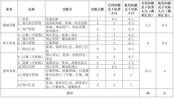 本项目共投入了3名项目人员,1名膳食中心管理人员及1名信息中心主管利用碎片化时间沟通需求、1名信息中心工程师全工作时间进行开发。系统分为基础设置、职工业务、患者业务三大板块,含12个页面、对应12个窗口迁移流程图,设计出36个界面联动窗口、对应36个功能点。系统建成2个月内,统计后台显示已处理了约6.4万餐次的订餐。膳食中心每天数据统计工作由人工转为系统自动化,原本在统计上需要花费的时间从2.5小时缩短为约30分钟,且该时间主要为后台数据确认、对个别重复数据进行纠错及科室沟通等。该系统将管理人员从重复易错的简单手工劳动中解出来,极大提高了膳食中心工作效率,进而提高了医院后勤管理效率。得益于数据的准确性和可追溯性,因统计错误等带来的矛盾与投诉也大幅减少,患者和临床的满意度得到较大提升(一)低代码平台大幅度提高开发效率