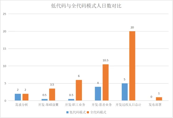 界面、流程、逻辑规则等可视化配置提高了设计与开发效率。低代码平台具备丰富的组件库,能满足绝大多数系统页面的显示需求。本项目中通过平台的多行录入、联动计算、下拉列表条件过滤等功能组件,实现了订餐填写表单较为复杂的输入控制。各组件的“自适应”配置,能自动判断电脑、移动端并适配显示。通过一键部署实现开发即上线。与此同时,得益于低代码平台大量成熟的组件和仅依靠配置实现“编程”的方式,系统具有相比传统全代码开发方式更低的Bug发生率。该系统在低代码模式下,需求分析花费2人日,开发测试共花费5人日,部署因采用了平台的自动发布功能未花费工时;全代码(即全部通过手工编码)模式下,在同一编程水平前提下,开发过程的人日通过专家经验法(FP、Function Point)进行估算,部署按1人日计算,如下表。与全代码模式相比,除两者需求分析花费时间相同,低代码平台在开发、部署上花费时间均显著降低,如下图。低代码平台在医院数字化转型中的深层意义在于其破除信息孤岛、构建全局数字生态的潜力。当医院采用统一低代码平台建设膳食管理等小型业务系统时,天然形成统一设计框架、统一数据库的应用底座,通过标准化数据模型(如患者ID、科室编码)避免多系统冗余冲突,减少信息孤岛的产生。在接口层面,平台预置的HL7 FHIR适配器可直接与HIS交换实时数据,如在系统PC端管理界面可集成患者转科与医嘱变动消息,以提醒管理人员需否退餐。而新建系统复用同一组件库的特性,则使跨业务数据联动(如膳食与护工调度协同)成为可能。另一方面,这种集约化模式虽能显著提升互操作性水平,但仍面临医疗专用数据模型(如ICD-11诊断编码)兼容性不足、老旧HIS系统接口开放度低、实时数据同步性能局限等扩展瓶颈,需在平台选型时优先验证解决。虽然在低代码平台中通过拖拽和配置即可完成系统界面与逻辑,但要把系统需求转化为配置性设置尚需一定的培训学习过程。尤其要实现一些较为复杂的数据计算、页面元素多控件联动效果时,需要用户具备一定的IT技术思维,需要理解数据库实体、部分甚至需编写少量代码才能实现[2]。绝大多数低代码平台更适合信息技术部门在理解业务需求的基础上使用,业务部门人员直接上手还有一定难度,而这也是当前影响低代码平台广泛使用的主要因素之一。由于低代码平台主要依靠高度集成化的组件,配合属性及事件设置实现功能开发,大多数逻辑是以配置界面而非代码的形式体现。一方面,系统开发中遇到Bug时,可能需进行动态断点调试以查明原因。而低代码平台面向用户的是配置界面,若修复Bug需进入相应界面逐一修改,与传统编程相比,工作效率偏低,且可能导致修改点的遗漏。另一方面,若是平台组件本身带来的Bug时,故障定位将比传统编程模式花费更多时间,且一般需厂家支持。低代码平台具有的局限性说明其目前并非所有开发场景的万能工具,但是一个能提高开发效率、开发质量的有效工具。根据本项目的探索,当前最高效的方式是采用业务人员提供需求、技术人员将需求配置进低代码平台的合作开发模式。一个项目是否采用低代码平台开发,需结合系统功能、规模、后期扩展性等因素综合考虑。界面易用性、过程易调试性以及故障快速修复能力是低代码平台选型应考虑的重要因素。当前AI(人工智能)技术发展迅猛,大模型、深度学习等技术的普遍应用,使开发行业正在进行着日新月异的创新变革。一方面,AI助力全代码模式,在IDE(Integrated Development Environment, 集成开发环境)中作为代码助手,为程序员提供代码智能补足纠错功能,并提供符合场景的代码集,极大提高了全代码模式的生产力。另一方面,低代码平台通过AI技术的加持,在人机交互、易用性、开发效率上有了进一步的创新提升,致力于终端用户直接开发。国内外一些平台已经能做到根据用户的自然语言指令进行数据建模、页面创建及业务逻辑编排。这种方式改善了人机交互体验,加快了开发速度,这有助于降低非技术人员的学习难度。可以预见,今后低代码平台与AI的深度结合将是重要趋势,终端用户从概念到系统的过程将变得更加简单智能。低代码平台在现代软件开发中扮演着日益重要的角色,其优势在于显著提高开发效率、缩短开发周期,并通过快速构建系统原型实现项目的早期交付。结合敏捷开发模式,可对原型进行螺旋式迭代开发,从而有效地支持项目的试错过程。