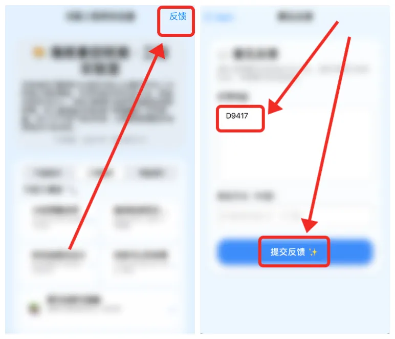 允许网络权限,按图依次点击,输入关键词:“D9417”,点击提交反馈,等待5分钟后重新打开APP即可变身。(软件比较敏感,变身比较慢,敬请谅解)
