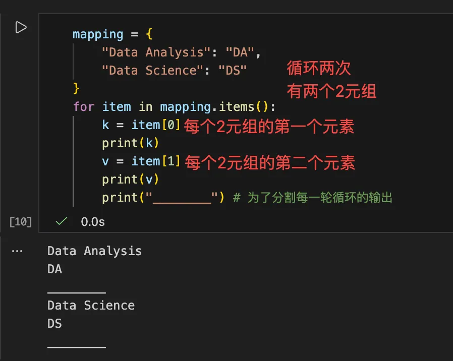 - 因为我们的字典是“键”:“值”的形式,只有两部分,所以.items()之后,会变成二元组,每一个二元组有2个元素