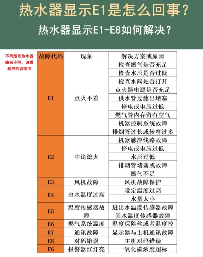 阅读说明书:不同品牌、型号的热水器故障代码可能略有差异,请以自家产品说明书为准