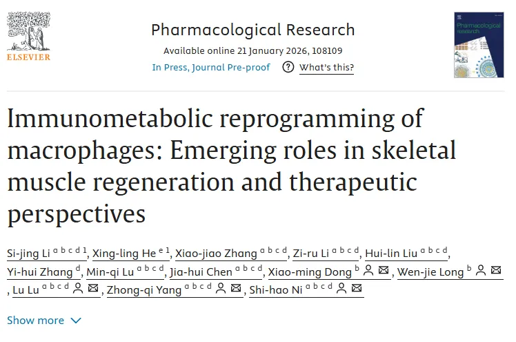 2026年1 月 21 日,广州中医药大学第一附属医院杨忠奇教授团队在国际权威药理学期刊 Pharmacological Research(中科院一区,IF=10.5)在线发表题为 “Immunometabolic reprogramming of macrophages: Emerging roles in skeletal muscle regeneration and therapeutic perspectives” 的综述研究论文。该文由李思静博士与何星灵博士共同担任第一作者,杨忠奇教授、鲁路研究员、倪世豪助理研究员等担任通讯作者,系统阐述了巨噬细胞免疫代谢重编程在骨骼肌再生及疾病相关肌肉萎缩中的关键作用,并进一步探讨了其作为潜在干预靶点的临床转化前景。