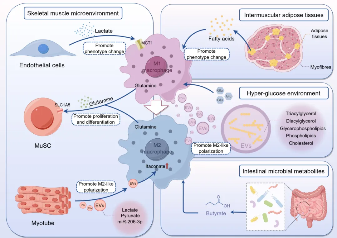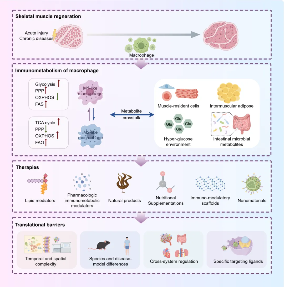近年来,代谢重编程被认为是驱动巨噬细胞功能转变、进而影响组织修复结局的核心内在机制。在肌肉再生过程中,巨噬细胞的糖代谢与线粒体氧化代谢会发生时序性切换,以协调其对炎症清除和再生支持的不同需求。同时,脂质与氨基酸代谢则同样调控着巨噬细胞的功能谱系,影响其与肌源性细胞的相互作用。此外,在衰老、慢性疾病等病理状态下,缺氧、胰岛素抵抗与肠道菌群失衡等系统性因素,可通过代谢反馈环路持续影响肌肉局部巨噬细胞的代谢表型,导致其功能失调,最终影响肌肉的有效修复与再生。