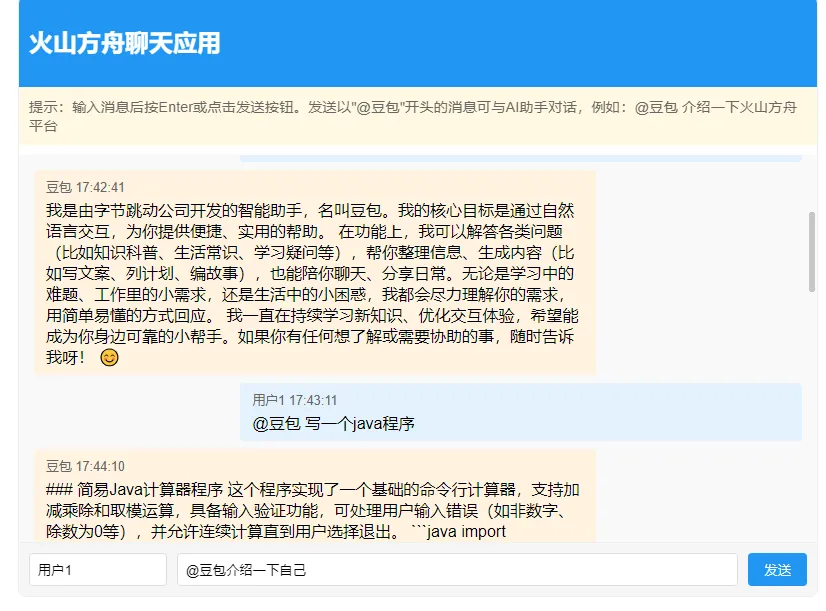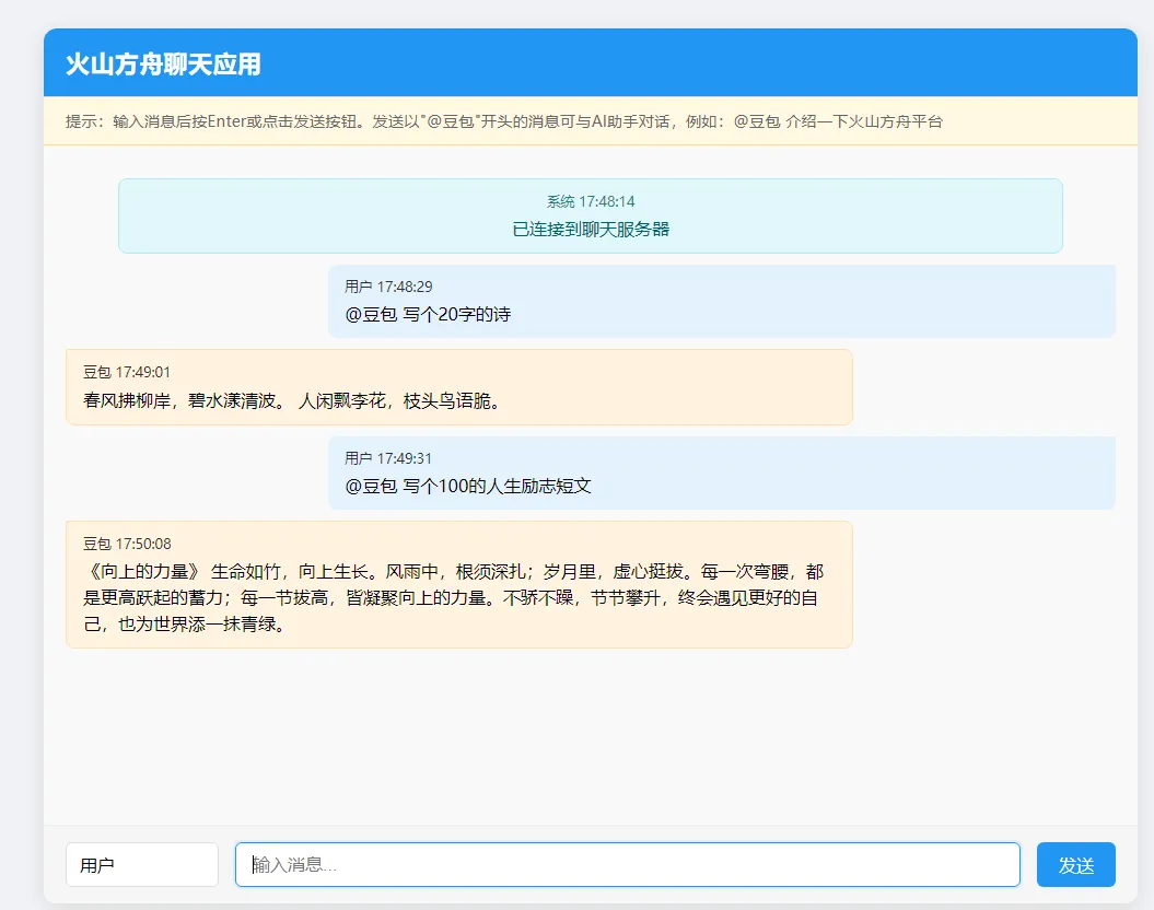 本文档提供完整的实时聊天应用实现方案,包含全屏居中布局、WebSocket实时通信、豆包API集成(基于火山方舟平台),且已移除Token验证,可直接部署使用。