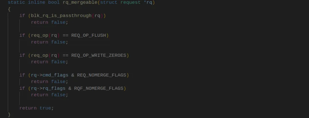staticvoiddd_finish_request(struct request *rq){structrequest_queue *q = rq->q;//判断请求队列q是否支持分区管理。如果支持,则需要处理分区锁定if (blk_queue_is_zoned(q)) {structdeadline_data *dd = q->elevator->elevator_data;unsignedlong flags; spin_lock_irqsave(&dd->zone_lock, flags);//释放请求 rq 所关联的分区锁定。 blk_req_zone_write_unlock(rq); spin_unlock_irqrestore(&dd->zone_lock, flags); }}在对请求进行合并时,提供了四种方法予以实现:
