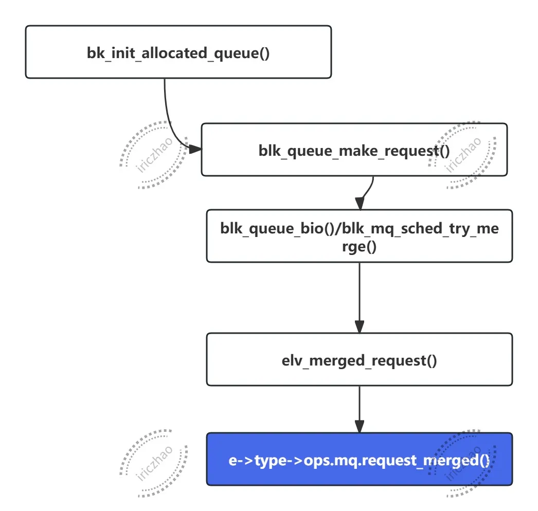 staticintdd_request_merge(struct request_queue *q, struct request **rq, struct bio *bio){structdeadline_data *dd = q->elevator->elevator_data;sector_t sector = bio_end_sector(bio);structrequest *__rq;//如果 deadline 调度器不支持前端合并,直接返回 ELEVATOR_NO_MERGE 表示无法合并。if (!dd->front_merges)return ELEVATOR_NO_MERGE;//在 dd->sort_list 中的指定红黑树 (bio_data_dir(bio) 决定的方向) 中查找与 sector 对应的请求。 __rq = elv_rb_find(&dd->sort_list[bio_data_dir(bio)], sector);if (__rq) { BUG_ON(sector != blk_rq_pos(__rq)); //断言请求的扇区号与sector相等//检查是否可以合并bio到__rq中if (elv_bio_merge_ok(__rq, bio)) {//如果可以合并 *rq = __rq; //将 __rq 赋值给 *rqreturn ELEVATOR_FRONT_MERGE;//返回 ELEVATOR_FRONT_MERGE 表示前端合并成功。 } }return ELEVATOR_NO_MERGE;}->requests_merged函数调用链: