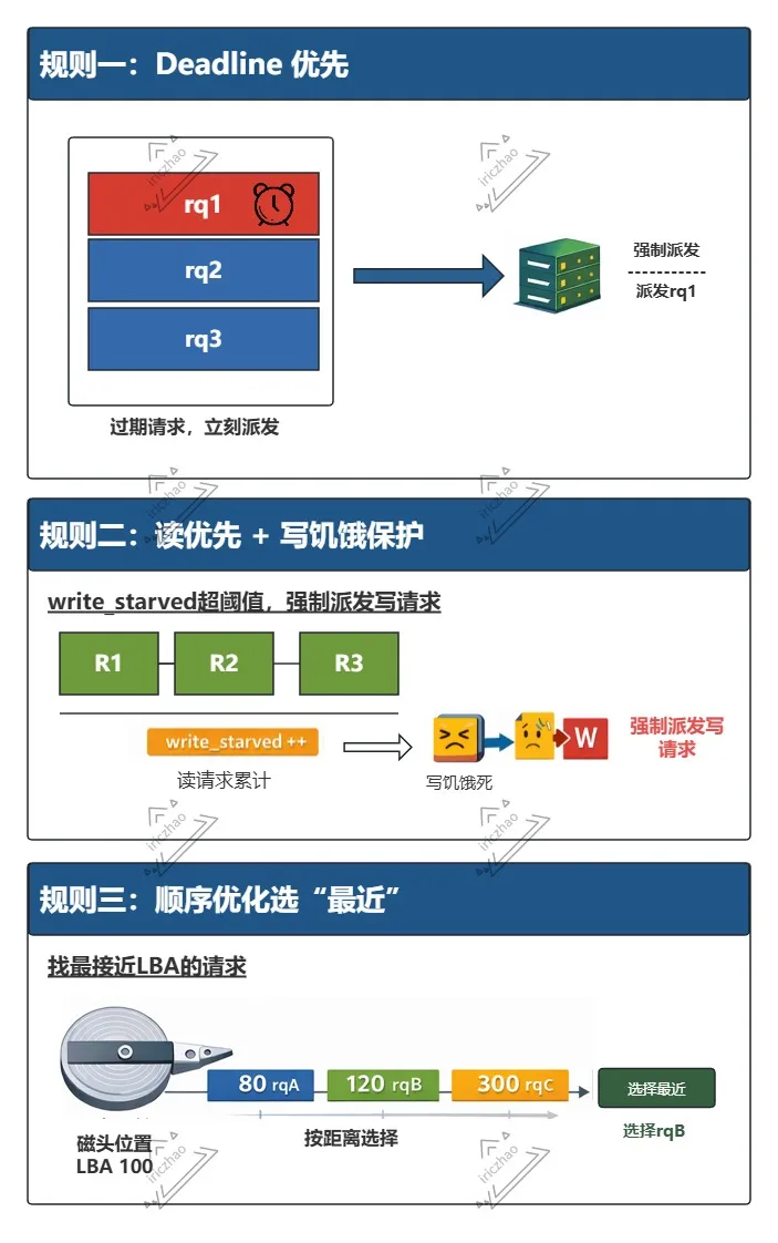 last_merge的缓存提示机制,front merge仍然可能发生。但该路径的代价几乎为 0,因此保留。综上所述,对于每个队列,MQ Deadline调度器根据请求的截止时间(deadline)和扇区号(sector)进行调度决策。MQ Deadline最佳请求的选择规则:
