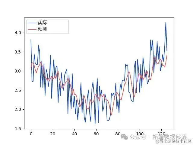 使用tensorflow.keras.models.load_model方法加载了训练好的模型(第32个epoch的模型),并使用gruMODEL.predict方法对测试集X_test进行预测。通过squeeze方法去除预测结果中可能存在的单一维度,然后使用mean_absolute_error计算了预测值与真实值之间的平均绝对误差(MAE),结果为0.02262356696266076。