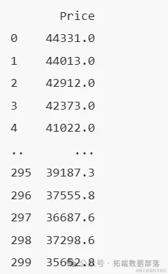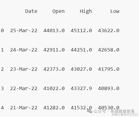 输出数据的前五行显示了日期(Date)、开盘价(Open)、最高价(High)和最低价(Low)等信息,这些被用作特征变量。而目标变量y则显示了对应日期的收盘价(Price)。
