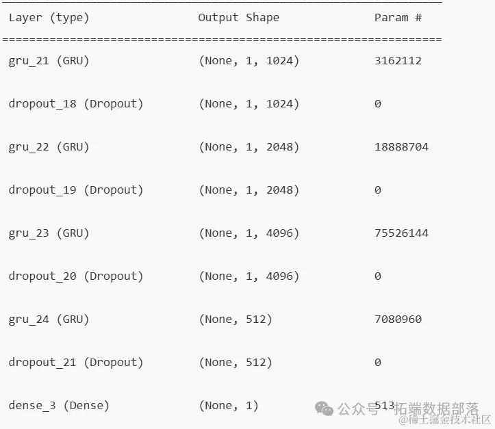 第一层是gru_21,这是一个GRU层,具有1024个神经元,其输出形状为(None, 1, 1024),意味着对于任意长度的输入序列,该层会输出一个长度为1的序列,每个序列元素是1024维的特征向量。该层包含3,162,112个参数。