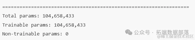 整个模型包含总共104,658,433个可训练参数,没有不可训练的参数。这些参数在模型训练过程中会被优化器调整,以最小化损失函数。模型的架构反映了从输入到输出的信息处理和特征提取的逐步深化过程。