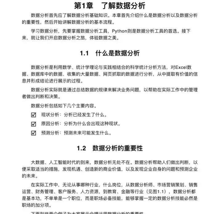 第 2 篇:实践篇。本篇以数据分析三剑客 Pandas、Matplotlib、NumPy 为核心主线,贴合数据分析 “数据清洗→处理→分析→可视化” 的真实流程展开讲解。不仅深度解析 Pandas 的数据处理与分析技巧、Matplotlib/Seaborn/Pyecharts 三大可视化工具的实战用法、NumPy 数组计算的核心逻辑,还通过 8 个覆盖电商、金融、用户行为等领域的典型统计分析案例,让你将零散知识点融会贯通,真正做到学以致用。