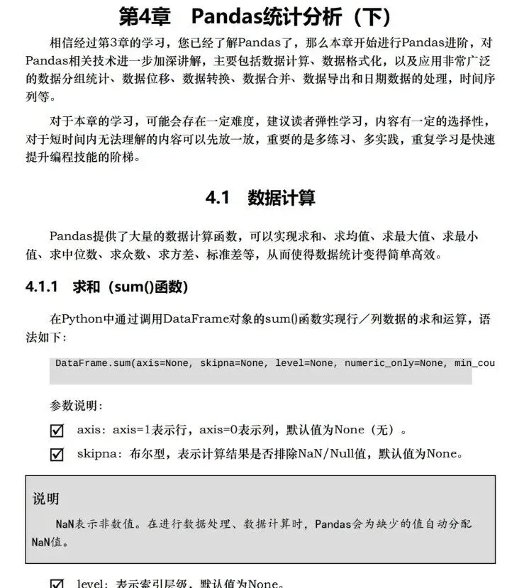 《Python 数据分析,从入门到精通》之所以能成为数据分析入门的首选书籍,核心优势体现在这 5 点:✅️技术全覆盖,一站式掌握:一本书囊括数据分析三剑客、三大可视化工具、主流机器学习库,无需东拼西凑,即可掌握数据分析领域所有核心技术栈。✅️零基础友好,易理解易上手:面对专业术语和复杂逻辑,书中配套大量示意图、生活场景类比讲解,彻底扫除入门壁垒,哪怕无 Python 基础也能轻松跟上节奏。✅️示例驱动,学习效率拉满:采用 “一个知识点 + 一个实操案例 + 一个可视化结果” 的模式,每个知识点都落地到具体代码,且几乎每行代码都附带详细注释,新手也能轻松读懂、复刻。✅️练够量,技能不脱节:全书包含 248 个细分应用示例、20 个综合练习案例、4 个完整项目案例,配套全套样本数据,边学边练,快速巩固数据处理与分析能力。✅️细节贴心,避坑更高效:全书穿插 “注意”“说明”“知识胶囊” 等特色栏目,精准标注易踩坑点、知识点拓展、实用技巧,帮你少走弯路,加速掌握数据分析核心技能。