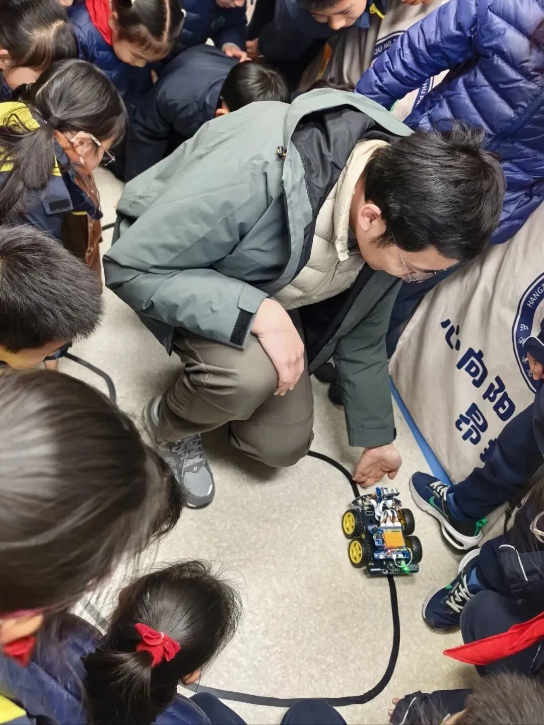 更神奇的演示开始了,珺琦爸爸将控制智能小车自动行驶的“魔法积木”上传到智能小车中,随后按下启动键,小车开始稳稳地沿着地上的黑色轨迹行驶,遇到弯道也能自动转弯。珺琦爸爸向同学们解释,这是小车通过底部的两颗红外传感器来识别黑色的道路。珺琦爸爸随后在小车前放置了障碍物,小车在接近时自动停下,并发出“滴滴”的警报声。珺琦爸爸继续对大家解释,这是小车通过前面的超声波传感器探测到了障碍物。孩子们围着小车,目不转睛,不时发出“哇”的惊叹。