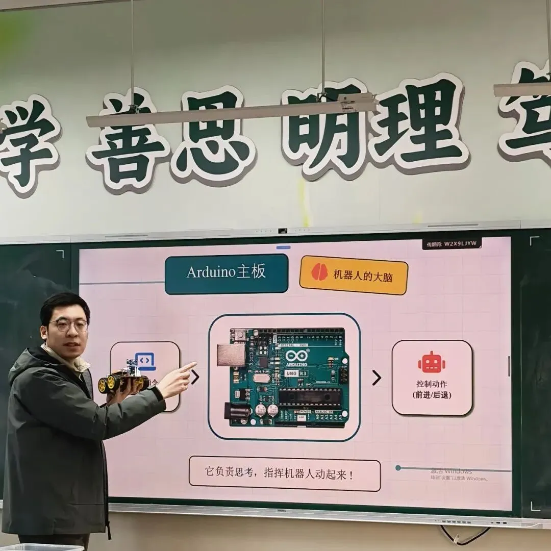 如果说Scratch打开了创造虚拟世界的大门,那么课程的第二部分—硬件编程Mixly,则真正将孩子们带入了现实的科技世界。当珺琦爸爸拿出Arduino智能机器人小车时,所有孩子的目光都被牢牢吸引。“这块绿色的板子就是机器人的大脑,叫做主板;这个像眼睛的是超声波传感器,可以测量距离;这些是轮子和电机,相当于它的腿;这个小喇叭是蜂鸣器,是它的嘴巴。”生动的比喻让孩子们立刻理解了智能小车上每个硬件的功能。