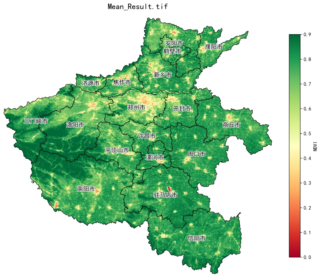 CONFIG = { # 1. 基础路径 "root_dir": r"D:\20260122", "input_folder": "GEE_MODIS_NDVI", "shp_folder": "shp", "shp_filename": "henan_city.shp", # 2. 地名标注 "label_field_name": "name", "label_font_size": 12, "show_labels": True, "show_boundaries": True, # 3. 数据参数 "nodata_value": -9999, "scale_factor": 1, # 4. 功能开关 (建议只开出图,省时间) "run_hdf_to_tif": False, "run_clip": False, # 裁剪过的不用再裁了 "run_mean": False, # 均值算过的不用再算了 "run_zonal": False, # 统计过的不用再统了 "run_plot": True, # <--- 只运行这个! # 5. 绘图参数 "plot_cmap": "RdYlGn", "plot_vmin": 0.0, "plot_vmax": 0.9, "plot_dpi": 300}# 设置中文字体 plt.rcParams['font.sans-serif'] = ['SimHei'] plt.rcParams['axes.unicode_minus'] = False