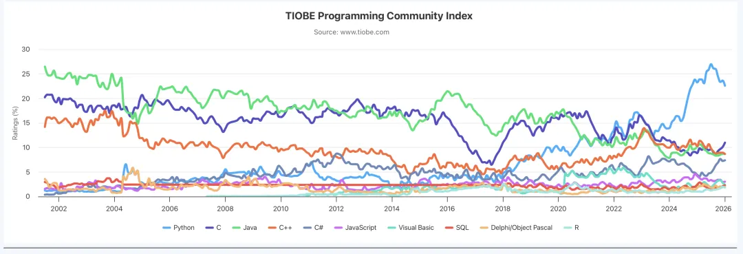 2025年TIOBE前十名还有这些有趣变动: