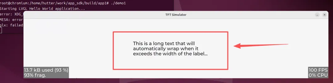 // 方法1:使用\n换行lv_label_set_text(label, "第一行\n第二行\n第三行");// 方法2:长文本自动换行(需要设置宽度)lv_obj_set_width(label, 400); // 设置标签宽度lv_label_set_long_mode(label, LV_LABEL_LONG_WRAP); // 设置长文本模式为自动换行lv_label_set_text(label, "This is a long text that will automatically wrap when it exceeds the width of the label...."); //超过宽度自动换行
