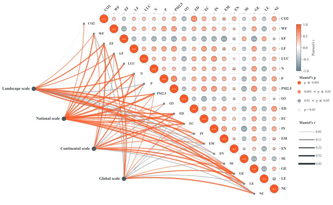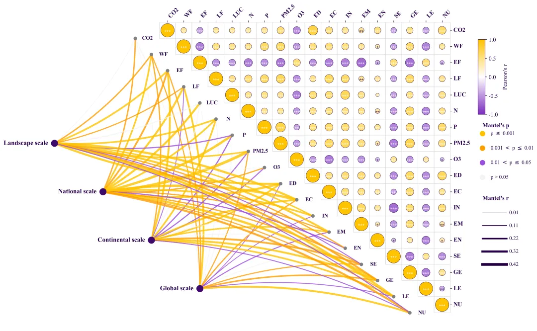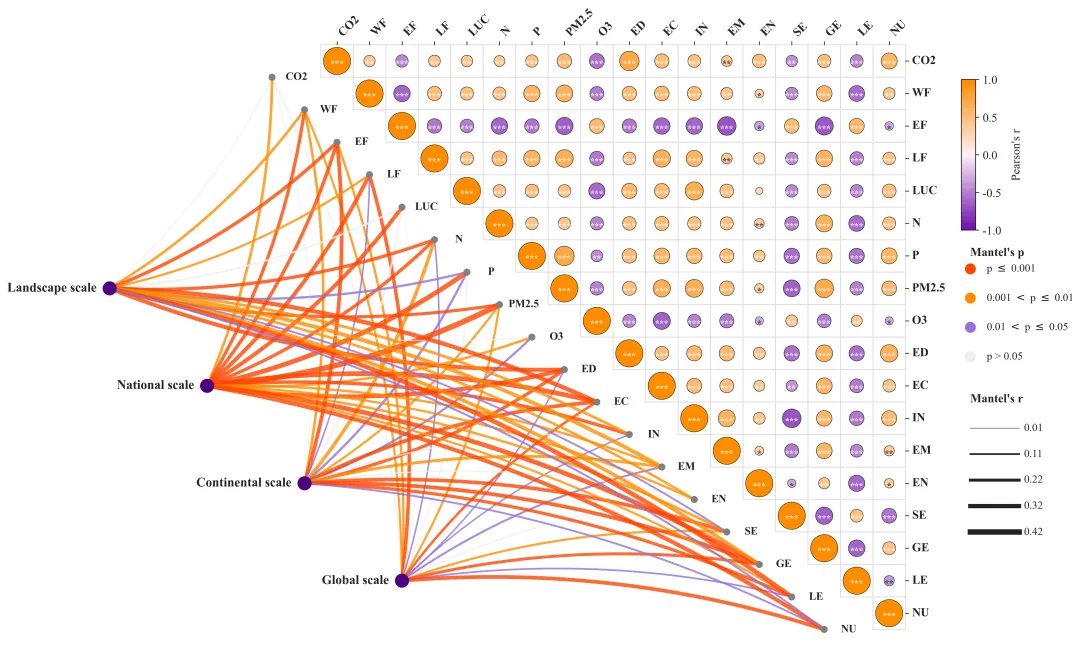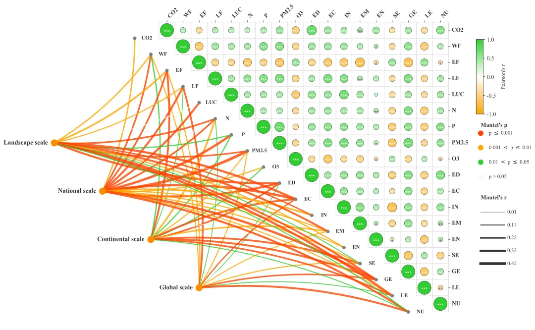 # =========================================================================================# ======================================2.颜色库=======================================# =========================================================================================if __name__ == "__main__":target_file = r'data.xlsx' #输入数据var_slice_obj = slice(0, 18) # 变量数据scale_slice_obj = slice(18, 22) # 目标数据df = pd.read_excel(target_file, sheet_name=0) # 读取df_vars = df.iloc[:, var_slice_obj] # 获取变量数据df_scales = df.iloc[:, scale_slice_obj] # 获取目标数据variables = df_vars.columns.tolist() # 获取变量名称scales = df_scales.columns.tolist() # 获取目标名称# 实例化标准化器scaler = StandardScaler()# 对变量数据标准化,并转回 DataFrame (保持列名和索引,方便后续 corr 计算)df_vars_std = pd.DataFrame(scaler.fit_transform(df_vars),columns=df_vars.columns,index=df_vars.index)# 对尺度数据标准化,并转回 DataFramedf_scales_std = pd.DataFrame(scaler.fit_transform(df_scales),columns=df_scales.columns,index=df_scales.index)left_data = df_vars_std.values # 获取变量数据的 numpy 数组right_data = df_scales_std.values # 获取目标数据的 numpy 数组n_left = left_data.shape[1] # 获取右侧变量数量n_right = right_data.shape[1] # 获取左侧目标数量mantel_r = np.zeros((n_left, n_right)) # 初始化存储 Mantel r 值的零矩阵mantel_p = np.zeros((n_left, n_right)) # 初始化存储 Mantel p 值的零矩阵mantel_df = pd.DataFrame(mantel_results_list) # 将结果列表转换为 DataFramecorr_matrix = df_vars.corr(method='pearson') # 计算右侧变量间的皮尔逊相关系数矩阵corr_r = corr_matrix.values # 获取相关系数数值矩阵corr_p_matrix = np.zeros((n_left, n_left)) # 初始化相关系数 p 值矩阵df_corr_p = pd.DataFrame(corr_p_matrix, index=variables, columns=variables)with pd.ExcelWriter(output_excel_path, engine='openpyxl') as writer:# Mantel Testmantel_df.to_excel(writer, sheet_name='Mantel_Results', index=False)# 变量间相关系数corr_matrix.to_excel(writer, sheet_name='Pearson_R_Matrix')#变量间相关性显著性df_corr_p.to_excel(writer, sheet_name='Pearson_P_Matrix')