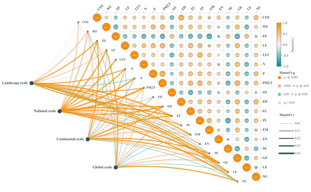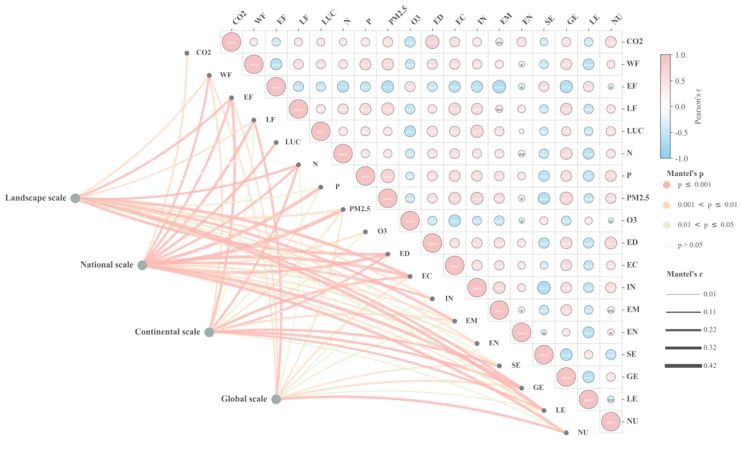 # =========================================================================================# ======================================6.绘图函数=======================================# =========================================================================================def plot_mantel_heatmap(variables, scales, corr_r, corr_p, mantel_df):text_color = config['text'] # 文本颜色node_color = config['node'] #节点颜色p_colors = config['p_colors'] #线颜色n_vars = len(variables) # 右侧热图变量的数量n_scales = len(scales) # 左侧节点的数量# 创建画布fig, ax = plt.subplots(figsize=(18, 14))ax.set_aspect('equal') # 坐标轴比例ax.axis('off') # 关闭坐标轴显示gap_size = 1.5 #、热图和右侧节点之间的间隔base_radius = 0.42 # 设置热图中圆点的基础半径系数anchor_coords = {} # 初始化字典,用于存储左侧变量的连接锚点坐标